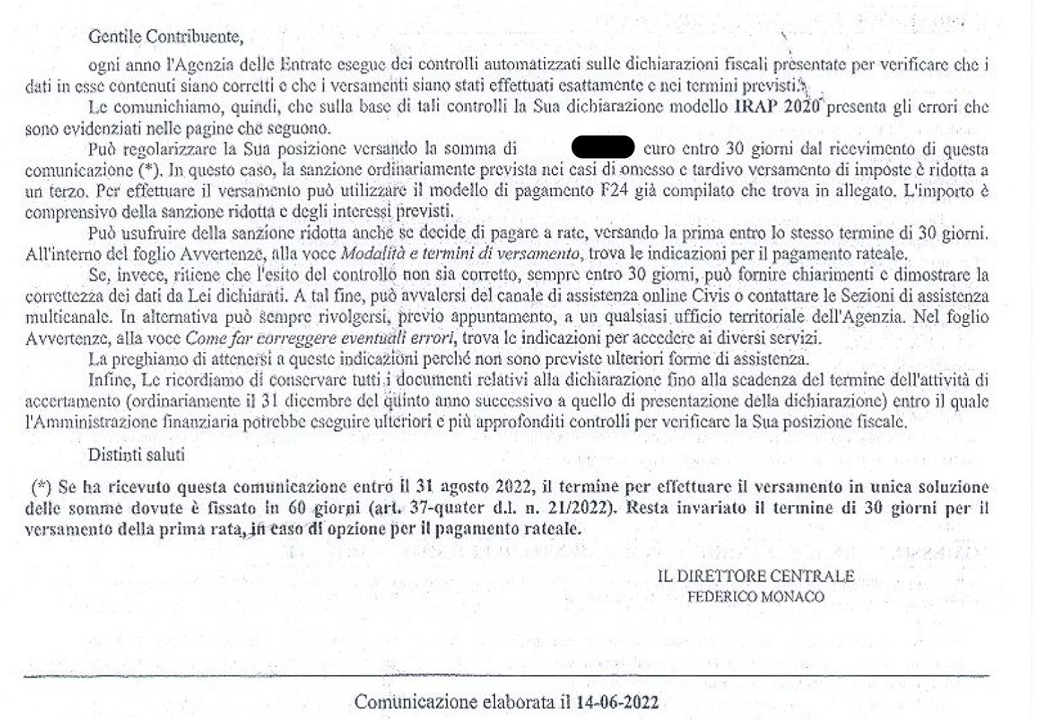 Oggetto: Comunicazioni di irregolarità saldo IRAP 2019 non dovuto ai sensi dell’art. 24 del D.L. 34/2020
