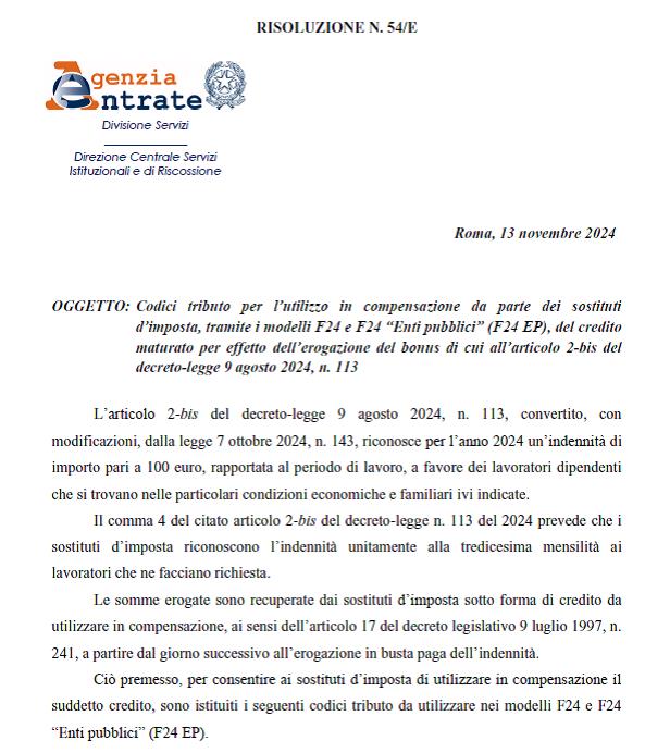 Il testo della risoluzione dell’Agenzia delle entrate n. 54 del 13 novembre 2024, con oggetto: RISCOSSIONE – REDDITO DA LAVORO DIPENDENTE – Bonus Natale – Disposizioni in materia di benefici corrisposti ai lavoratori dipendenti con reddito complessivo non superiore a 28.000 euro nell’anno d’imposta 2024 – Codici tributo per l’utilizzo in compensazione da parte dei sostituti d’imposta, tramite i modelli F24 e F24 “Enti pubblici” (F24 EP), del credito maturato per effetto dell’erogazione del bonus di cui all’articolo 2-bis D.L. 09/08/2024, n. 113, conv. con mod., dalla L. 7/10/2024, n. 143.