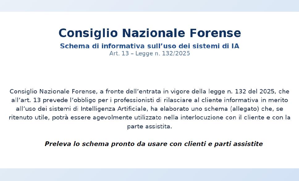 Il C.N.F., a fronte dell’entrata in vigore della legge n. 132 del 2025, che all’art. 13 prevede l’obbligo per i professionisti di rilasciare al cliente informativa in merito all’uso dei sistemi di Intelligenza Artificiale, ha elaborato uno schema che, se ritenuto utile, potrà essere agevolmente utilizzato dai Colleghi nella interlocuzione con il cliente e con la parte assistita.