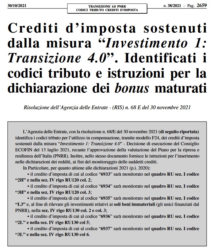 L’Agenzia delle Entrate, con la risoluzione n. 68/E del 30 novembre 2021 (di seguito riportata) identifica i codici tributo per l’utilizzo in compensazione, tramite modello F24, dei crediti d’imposta sostenuti dalla misura “Investimento 1: Transizione 4.0” – Decisione di esecuzione del Consiglio ECOFIN del 13 luglio 2021, recante l’approvazione della valutazione del Piano per la ripresa e resilienza dell’Italia (PNRR)