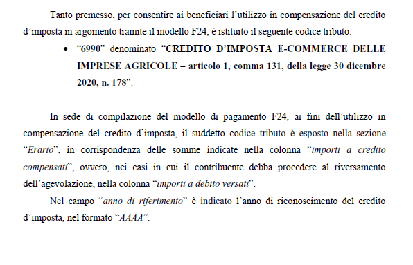 Per l’utilizzo in compensazione, con la risoluzione n. 64/E di oggi viene istituito il codice tributo 6990, denominato “credito d’imposta e-commerce delle imprese agricole”.