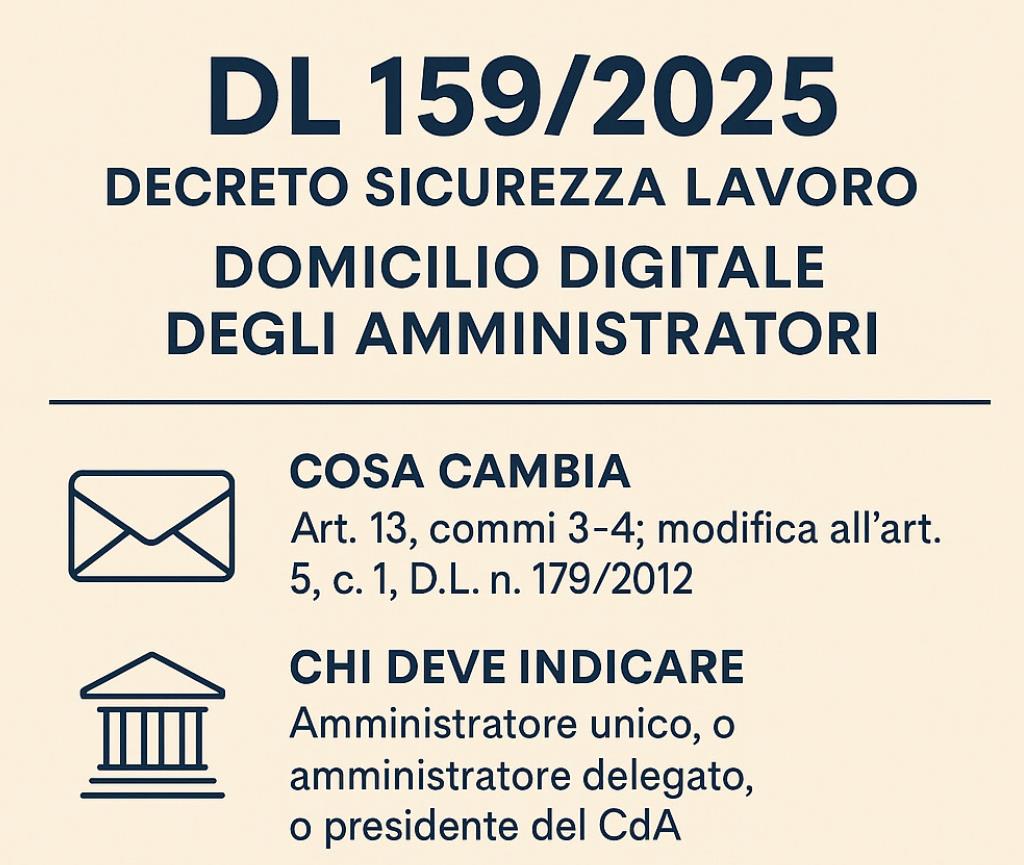 Il decreto-legge 31 ottobre 2025, n. 159, recante «Misure urgenti per la tutela della salute e della sicurezza sui luoghi di lavoro e in materia di protezione civile», in vigore dal 31 ottobre 2025, interviene sul discusso obbligo di domicilio digitale degli amministratori introdotto dalla legge di Bilancio 2025, restringendo la possibilità di utilizzare la PEC dell’impresa come “domicilio digitale” dell’amministratore.