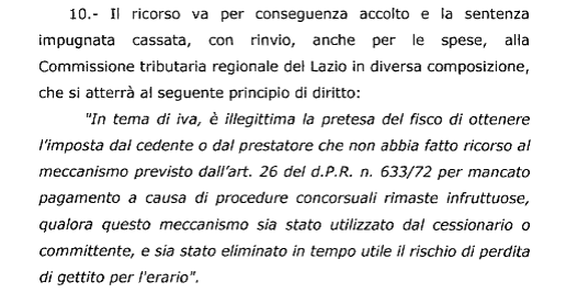 La Massima – In tema di IVA, è illegittima la pretesa del fisco volta ad ottenere l’imposta dal cedente o dal prestatore che non abbiano fatto ricorso al meccanismo previsto dall’art. 26 del D.P.R. n. 633 del 1972 per mancato pagamento a causa di procedure concorsuali rimaste infruttuose (per l’applicazione del quale non è necessaria la certezza dell’irrecuperabilità) qualora questo meccanismo sia stato utilizzato dal cessionario o dal committente e sia così stato eliminato in tempo utile il rischio di perdita di gettito per l’erario.