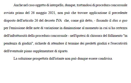 Link al testo della risposta ad interpello dell’Agenzia delle Entrate n. 471 del 29 novembre 2023, con oggetto: IVA (Imposta sul valore aggiunto) – Base imponibile – Variazione dell’imponibile o dell’imposta – Riduzione della base imponibile in ipotesi di non pagamento totale o parziale intervenuto dopo che l’operazione è stata effettuata – Variazioni in diminuzione per mancato pagamento in tutto o in parte a causa di procedure concorsuali o di procedure esecutive rimaste infruttuose – Procedura concorsuale avviata prima del 26 maggio 2021 – Conseguenze – Applicazione dell’articolo 26 del D.P.R. n. 633/1972 nella versione vigente ante 26 maggio 2021 – Inapplicabilità dell’attuale formulazione dell’articolo 26 del D.P.R. IVA come modificato dall’articolo 18 del decreto-legge 25 maggio 2021, n. 73, convertito, con modificazioni, dalla legge 23 luglio 2021, n. 106, con riferimento alle procedure concorsuali avviate dal 26 maggio 2021 – Caso di specie – Chiusura del fallimento ‘‘in pendenza di giudizi’’- “Dies a quo” ai fini dell’emissione della nota di variazione in diminuzione – Necessità di attendere i predetti giudizi e l’esecutività dell’eventuale piano supplementare di riparto – Affermazione – Articolo 118 del RD 16 marzo 1942, n. 267 (Legge Fall. vigente ratione temporis) – Art. 90 della Direttiva 2006/112/CE – Art. 26, del DPR 26/10/1972, n. 633