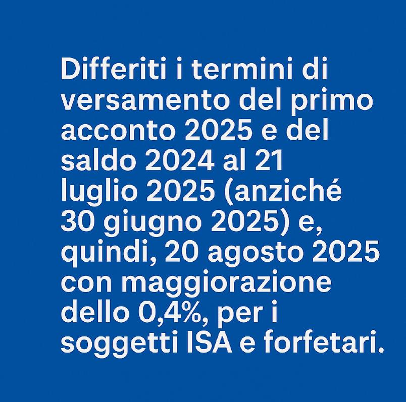 Per il 2025, vengono differiti i termini di versamento del primo acconto 2025 e del saldo 2024 al 21 luglio 2025 (anziché 30 giugno 2025) e, quindi, 20 agosto 2025 con maggiorazione dell’0,4%, per i soggetti ISA e forfetari.