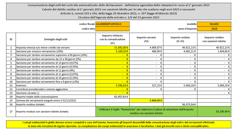 Per agevolare i contribuenti nella determinazione dell’importo residuo da versare, con sanzioni ridotte, l’Agenzia delle entrate ha predisposto un apposito foglio di calcolo – xlsx (versione 1.3).