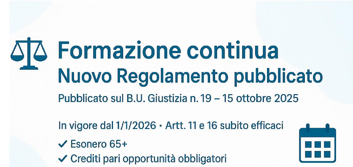 Le restanti disposizioni del Regolamento, che entreranno in vigore il 1° gennaio 2026, introducono una serie di novità volte a rendere la formazione professionale continua più coerente con l’evoluzione normativa, a rafforzare le tutele in materia di pari opportunità e a prevedere, tra le cause di esonero, quella per anzianità, riservata agli iscritti che abbiano o compiano 65 anni nel triennio formativo, quale riconoscimento della lunga esperienza professionale acquisita.
