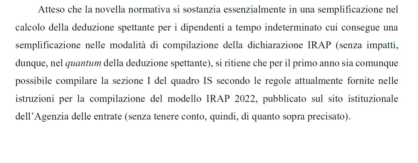 Atteso che la novella normativa si sostanzia essenzialmente in una semplificazione nel calcolo della deduzione spettante per i dipendenti a tempo indeterminato cui consegue una semplificazione nelle modalità di compilazione della dichiarazione IRAP (senza impatti, dunque, nel quantum della deduzione spettante), si ritiene che per il primo anno sia comunque possibile compilare la sezione I del quadro IS secondo le regole attualmente fornite nelle istruzioni per la compilazione del modello IRAP 2022, pubblicato sul sito istituzionale dell’Agenzia delle entrate (senza tenere conto, quindi, di quanto sopra precisato).