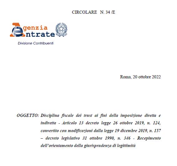 Link al testo della circolare dell’Agenzia delle Entrate n. 34 E del 20 ottobre 2022, con oggetto: TRUST – IMPOSTE SUI REDDITI -IMPOSTA SULLE SUCCESSIONI E DONAZIONI – IMPOSTE IPOTECARIE E CATASTALI – – Convenzione dell’Aja del 1° luglio 1985, resa esecutiva con L. 16/10/1989, n. 364 – Recepimento dell’orientamento della giurisprudenza di legittimità – Art. 13 del DL 26/10/2019, n. 124, conv., con mod., dalla L 19/12/2019, n. 157 – D.Lgs. 31/10/1990, n. 346