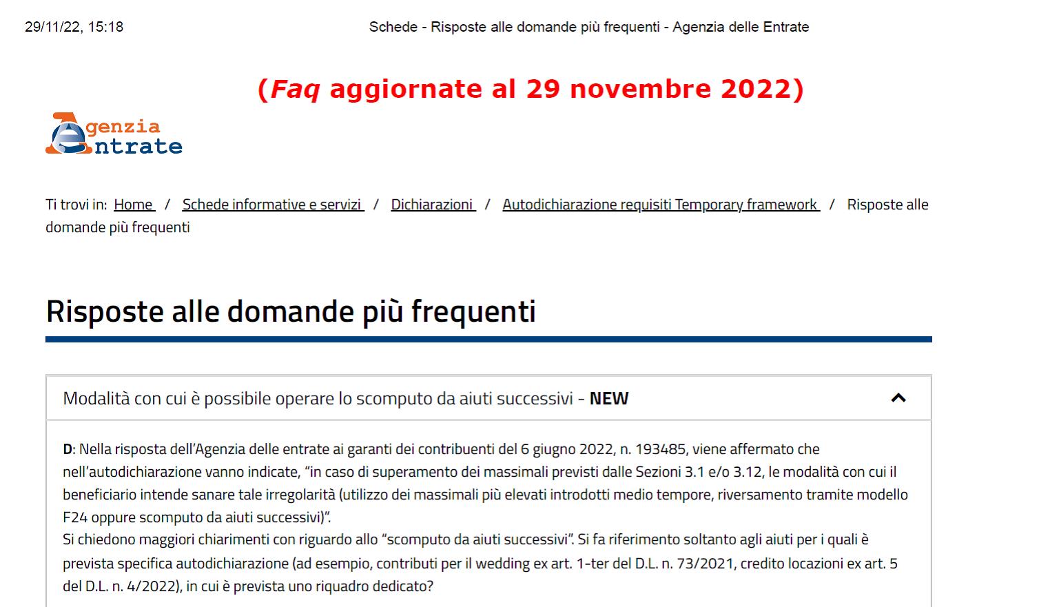 Online le risposte dell’Agenzia delle entrate alle domande (aggiornamento del 29 novembre 2022) più frequenti sulle modalità di compilazione dell’autodichiarazione per gli aiuti di stato Covid 19 da presentare entro il 30 novembre 2022.