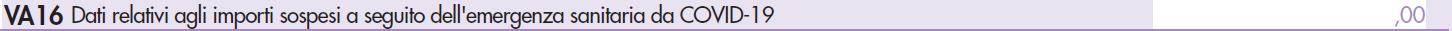 Nella sezione 2, il Rigo VA16 riservato alle federazioni sportive nazionali, enti di promozione sportiva e associazioni e società sportive professionistiche e dilettantistiche con domicilio fiscale, sede legale o sede operativa nel territorio dello Stato che operando nell’ambito di competizioni sportive in corso di svolgimento ai sensi del D.P.C.M. 24 ottobre 2020, hanno usufruito della sospensione dei versamenti IVA in scadenza nei mesi di gennaio e febbraio 2021 disposta dall’articolo 1, comma 36, lettera c), della legge n. 178 del 2020. Nel rigo va indicato l’ammontare complessivo dei versamenti sospesi.