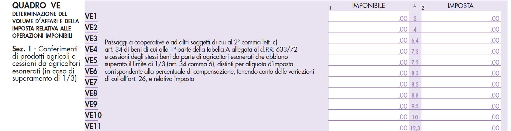 Nella sezione 1, rigo VE3, la percentuale di compensazione del 6 per cento è stata sostituita con la percentuale del 6,4 per cento, prevista dal decreto ministeriale 19 dicembre 2021. Inoltre, sono state eliminate le percentuali di compensazione del 7,65 e 7,95 per cento, sostituite con la percentuale di compensazione del 9,5 per cento dall’articolo 68 del decreto-legge 25 maggio 2021, n. 73, conv., con mod., dalla legge 23 luglio 2021, n. 106, cd. Decreto Sostegni-bis. Conseguentemente i righi della sezione sono stati rinumerati.