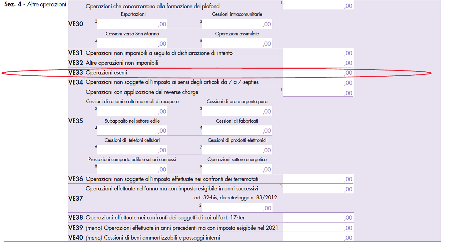 Nella sezione 4, il Rigo VE33 per indicare l’ammontare delle operazioni esenti di cui all’art. 10. Nel rigo vanno indicate anche le operazioni esenti di cui all’art. 1, commi 452 e 453, della legge n. 178 del 2020. I contribuenti per i quali ha avuto effetto, per l’anno 2021, la dispensa di cui all’art. 36-bis dagli obblighi di fatturazione e di registrazione relativamente alle operazioni esenti, devono indicare in questo rigo esclusivamente le operazioni di cui ai nn. 11, 18 e 19, e al terzo comma dell’art. 10 per le quali resta in ogni caso fermo l’obbligo di fatturazione e registrazione (vedi infra).