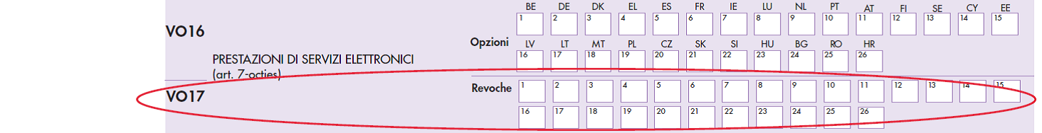 Inoltre, è stato introdotto il nuovo rigo VO17 per consentire ai soggetti che effettuano le prestazioni di servizi indicate nell’art. 7-octies nei confronti di committenti non soggetti passivi stabiliti in Stati membri dell’Unione europea diversi dall’Italia di comunicare la revoca dell’opzione in precedenza esercitata.