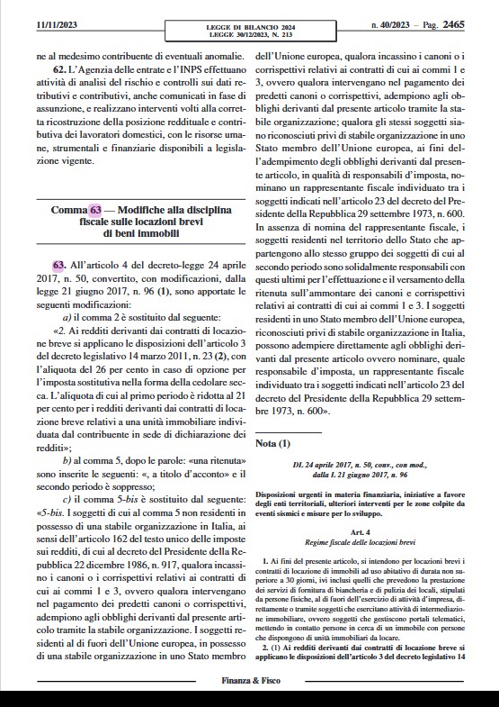 Con la circolare n. 10 del 10 maggio 2024, l’Agenzia delle Entrate fornisce istruzioni agli uffici sulle novità introdotte sulle locazioni brevi dalla Legge di bilancio 2024 (Legge 30 dicembre 2023, n. 213). Nuove regole anche per gli intermediari immobiliari e i gestori di portali telematici di locazioni che, all’atto del pagamento al locatore, dovranno sempre operare, in qualità di sostituti d’imposta, una ritenuta del 21% a titolo d’acconto indipendentemente dal regime fiscale adottato dal beneficiario. Il documento di prassi, inoltre, illustra nel dettaglio la disposizione con cui la Legge di Bilancio 2024 adegua la legislazione nazionale al contenuto della sentenza sugli adempimenti fiscali degli intermediari non residenti emanata dalla Corte di giustizia dell’Unione europea il 22 dicembre 2022.