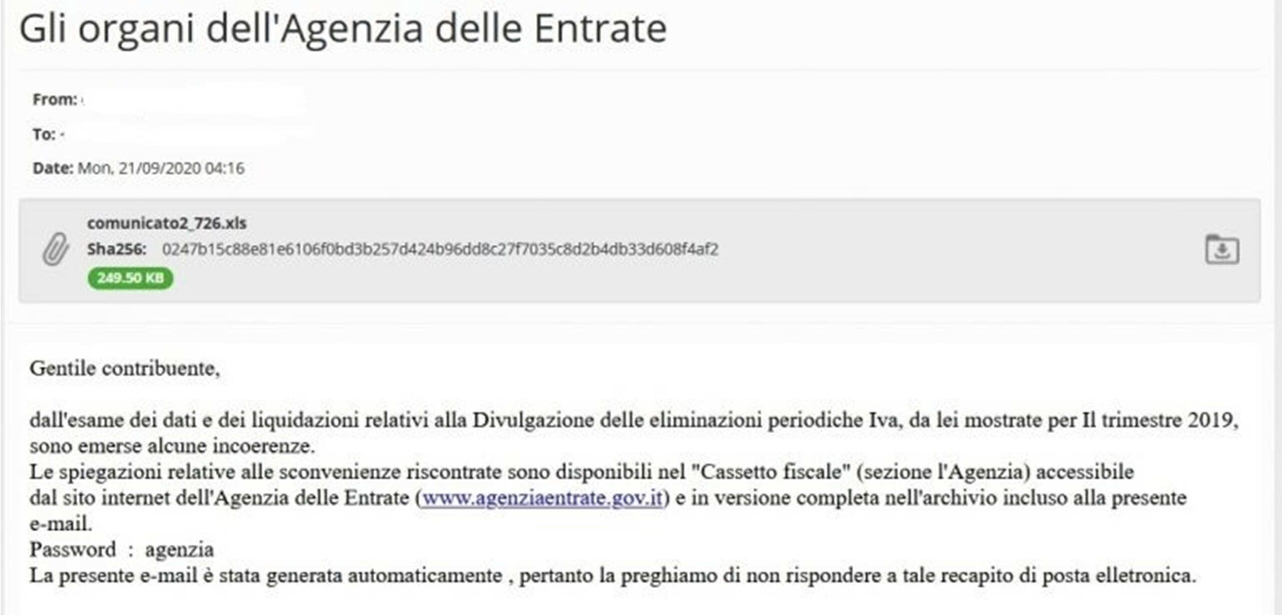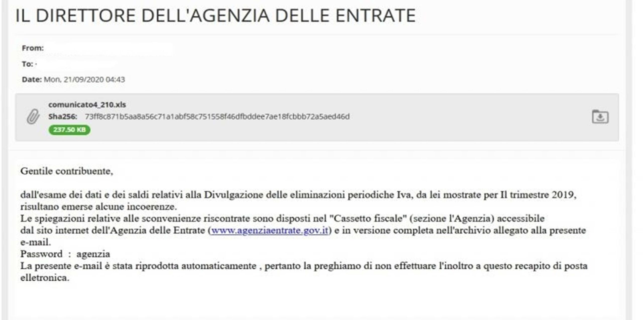 Sono in corso nuovi tentativi di phishing a danno degli utenti attraverso email che sembrano essere riconducibili all’Agenzia. L’Agenzia è estranea a tali messaggi ed invita gli utenti a cestinare immediatamente messaggi di posta elettronica che riportano nell’intestazione la dicitura “IL DIRETTORE DELL’AGENZIA” o “GLI ORGANI DELL’AGENZIA” e che, nel testo, invitano a prendere visione di documenti contenuti in un archivio allegato per verificare “alcune incoerenze” emerse “dall’esame dei dati e dei saldi relativi alla Divulgazione delle eliminazioni periodiche Iva”. Le email, infatti, non provengono dall’Agenzia, ma costituiscono il tentativo di installare un malware sui dispositivi dei destinatari anche allo scopo di acquisire successivamente informazioni riservate.