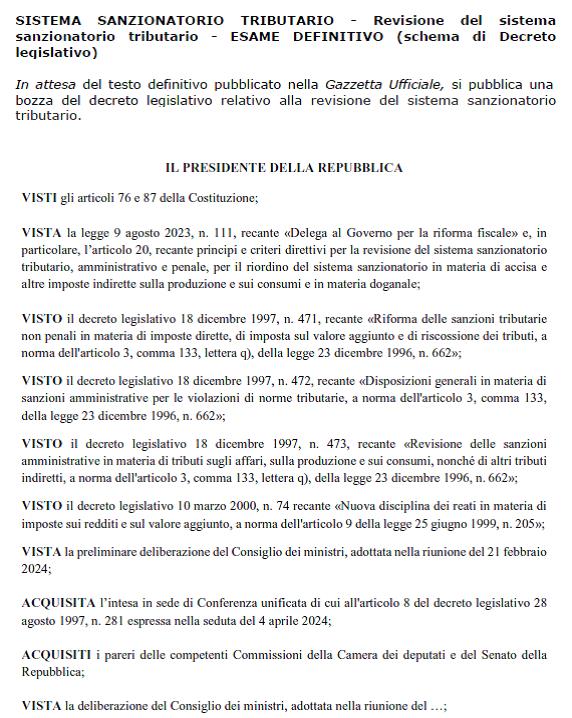 Il Consiglio dei Ministri di venerdì 24 maggio 2024, su proposta del Ministro dell’Economia e delle Finanze, Giancarlo Giorgetti, ha approvato in via definitiva un decreto legislativo relativo alla revisione del sistema sanzionatorio tributario.