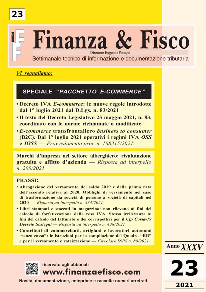 Decreto IVA E-commerce: le nuove regole introdotte dal 1° luglio 2021 dal D.Lgs. n. 83/2021 Il testo del Decreto Legislativo 25 maggio 2021, n. 83, recante: «Recepimento degli articoli 2 e 3 della direttiva (UE) 2017/2455 del Consiglio del 5 dicembre 2017 che modifica la direttiva 2006/112/CE e la direttiva 2009/132/CE per quanto riguarda taluni obblighi in materia di imposta sul valore aggiunto per le prestazioni di servizi e le vendite a distanza di beni e della direttiva (UE) 2019/1995 del Consiglio del 21 novembre 2019 che modifica la direttiva 2006/112/CE per quanto riguarda le disposizioni relative alle vendite a distanza di beni e a talune cessioni nazionali di beni» coordinato con le norme richiamate o modificate Provvedimento del Direttore dell’Agenzia delle entrate del 25 giugno 2021, prot. n. 168315/2021: «Individuazione degli Uffici competenti allo svolgimento delle attività e dei controlli di cui ai regimi speciali in materia di imposta sul valore aggiunto (denominati “One Stop Shop” o “Oss” e “Import scheme” o “Ioss”) e modalità operative e gestionali per l’attuazione delle disposizioni di cui agli articoli 74-quinquies, 74-sexies, 74-sexies.1 e 74-septies del decreto del Presidente della Repubblica 26 ottobre 1972 n. 633» |