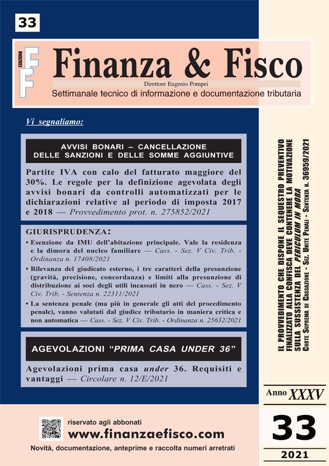 Corte Suprema di Cassazione – Sezione V Civile Tributaria – Sentenza n. 22311 del 5 agosto 2021: «CONTENZIOSO TRIBUTARIO – Giudicato esterno – Rilevanza di un diverso giudizio – Efficacia esterna della sentenza del giudice tributario – Portata – Su diverse annualità della medesima imposta – Possibilità – Limiti – Sentenza che risolve una situazione fattuale riferita ad uno specifico periodo d’imposta – Inefficacia ad estendere i suoi effetti automaticamente ad un’altra annualità, ancorché, siano coinvolti tratti storici comuni (medesima verifica fiscale) – Art. 2909 c.c. • PROVA CIVILE -Prove indiziarie – Presunzioni (nozione) – Semplici – Sindacato del giudice di merito – Censurabilità in sede di legittimità – Vizio denunciabile – Violazione o falsa applicazione di norme di diritto – Modalità – Art. 360, n. 3, c.p.c. – Art. 2729 c.c. • IMPOSTE SUI REDDITI – IRPEF (Imposta sul reddito delle persone fisiche) – Redditi di capitale – Società di capitali a ristretta base partecipativa – Utili extracontabili – Distribuzione ai soci – Presunzione – Prova contraria – Ammissibilità – Dimostrazione della estraneità alla gestione societaria – Necessità – Art. 44, del D.P.R. 22/12/1986, n. 917»