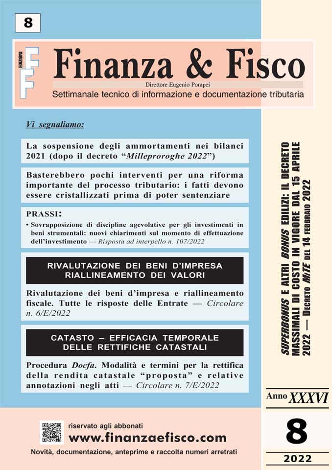 Circolare dell’Agenzia delle Entrate n. 6 E del 1° marzo 2022: «RIVALUTAZIONE E RIALLINEAMENTO – Rivalutazione per i settori alberghiero e termale – Chiarimenti e risposte ai quesiti – Art. 6-bis, del D.L. 08/04/2020, n. 23, conv., con mod., dalla L. 05/06/2020, n. 40 (D.L. “Liquidità”) – Art. 110, del D.L. 14/08/2020, n. 104, conv., con mod., dalla L. 13/10/2020, n. 126 (D.L. “Agosto”) – Art. 1, commi 622, 623 e 624 della L. 30/12/2021, n. 234 (Legge di Bilancio 2022) – Artt. 11, 13 e 15, della L 21/11/2000, n. 342 – D.M. 13/04/2001, n. 162 – D.M. 19/04/2002, n. 86»