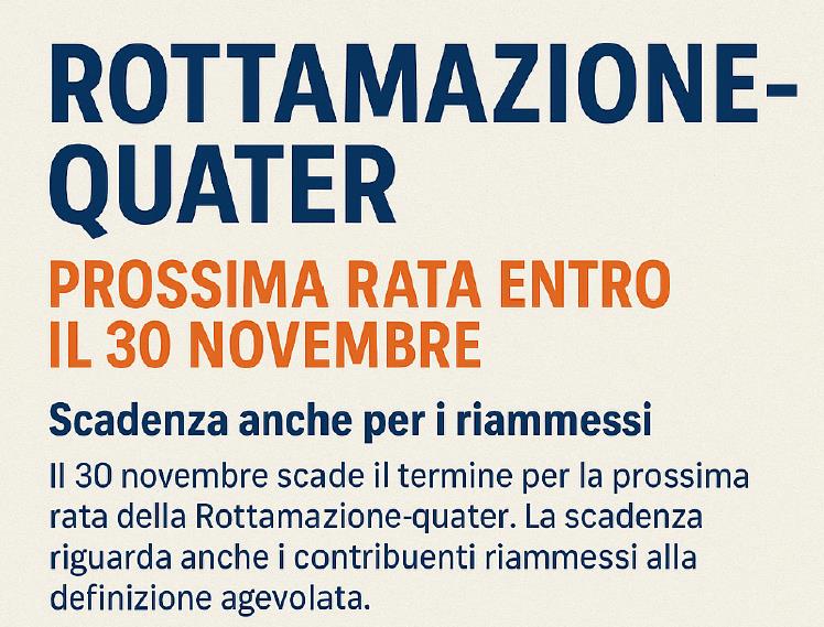 Il 30 novembre scade il termine per la prossima rata della Rottamazione-quater. La scadenza riguarda i contribuenti in regola con i versamenti precedenti che devono pagare la decima rata e, nel caso dei riammessi alla definizione agevolata (Legge n. 15/2025), la seconda rata prevista dal nuovo piano dei pagamenti. In considerazione dei 5 giorni di tolleranza concessi dalla legge, e dei differimenti previsti in caso di termini coincidenti con giorni festivi, saranno considerati tempestivi i pagamenti effettuati entro il 9 dicembre 2025.