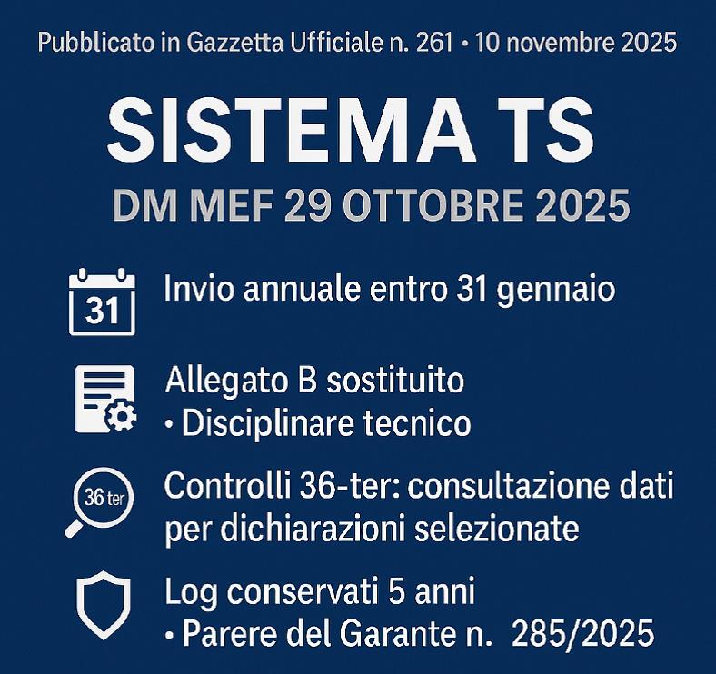 Pubblicato nella Gazzetta Ufficiale n. 261 del 10 novembre 2025 il D.M. Mef 29 ottobre 2025 che modifica il D.M. 19 ottobre 2020 sulla trasmissione delle spese sanitarie al Sistema Tessera Sanitaria (TS) e sostituisce il relativo Allegato B – Disciplinare tecnico.