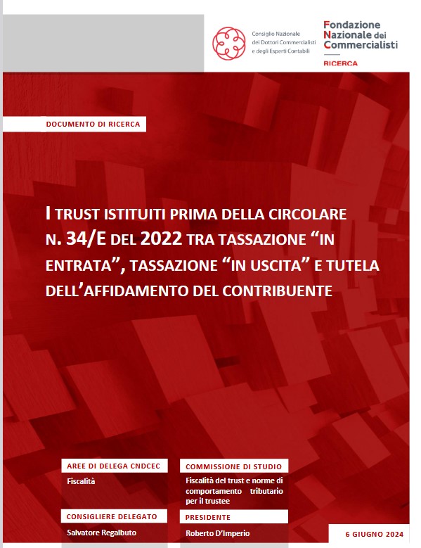 Link al Documento di Ricerca del Consiglio Nazionale dei Dottori Commercialisti e degli Esperti Contabili e della Fondazione Nazionale dei Commercialisti del 6 giugno 2024 – I trust istituiti prima della circolare n. 34/E del 2022 tra tassazione “in entrata”, tassazione “in uscita” e tutela dell’affidamento del contribuente – Link al sito: https://www.fondazionenazionalecommercialisti.it/node/1770